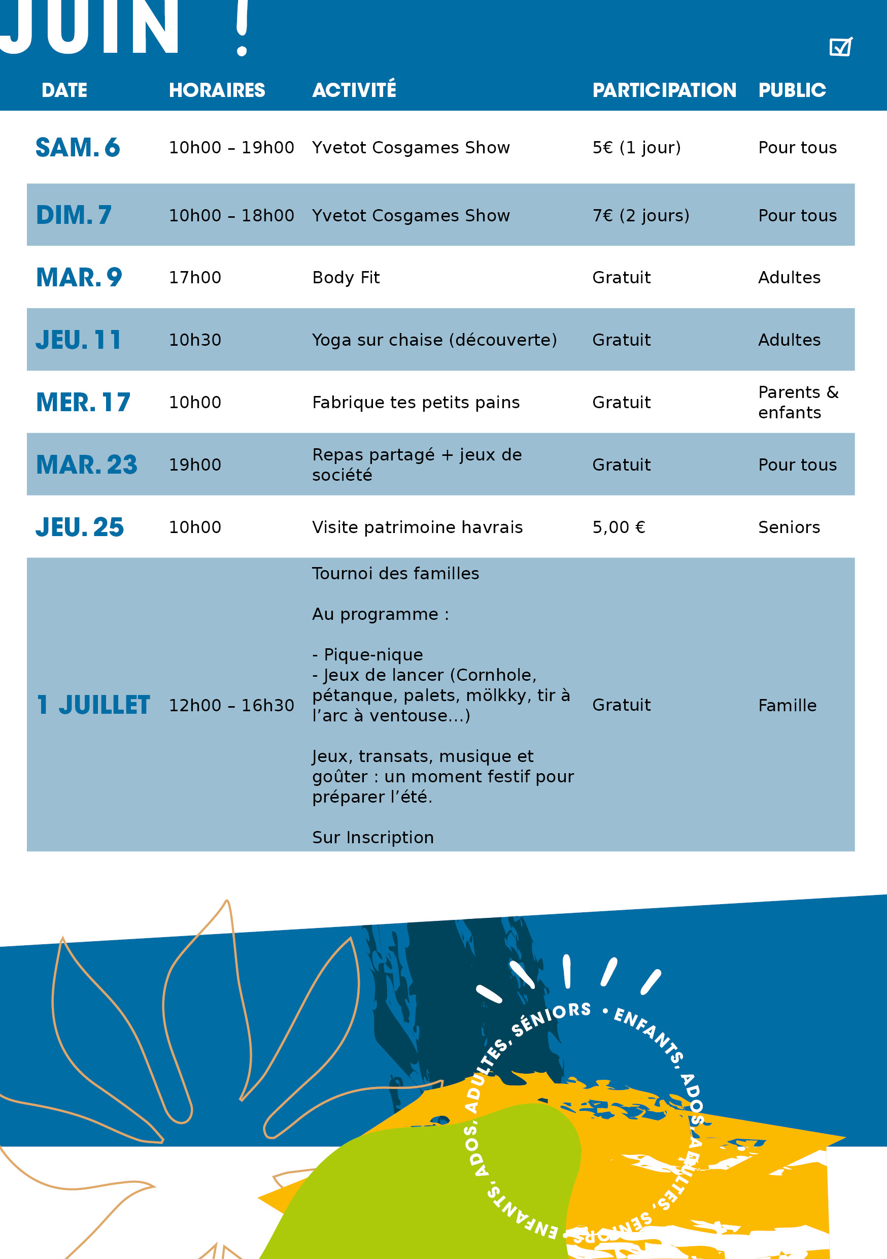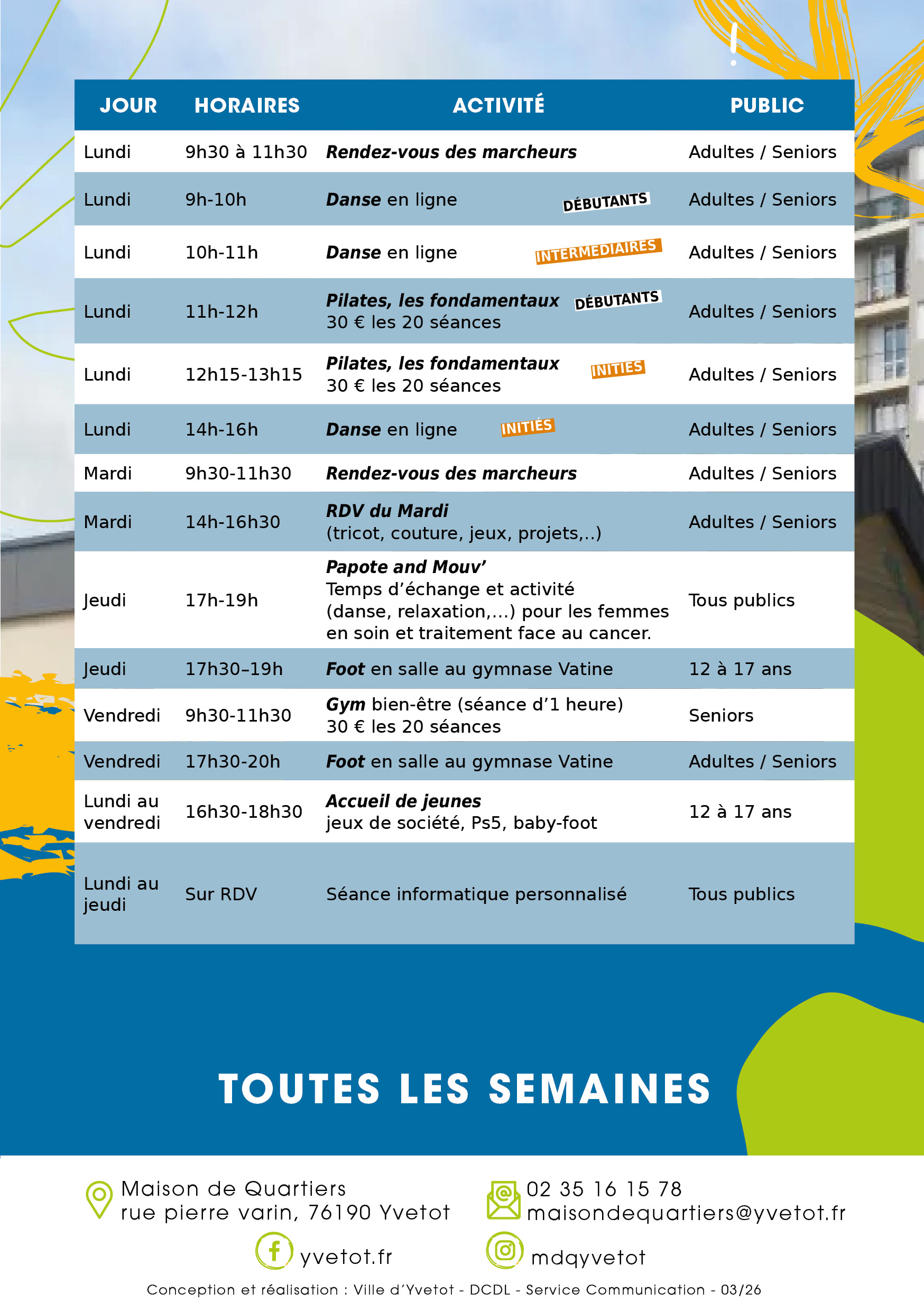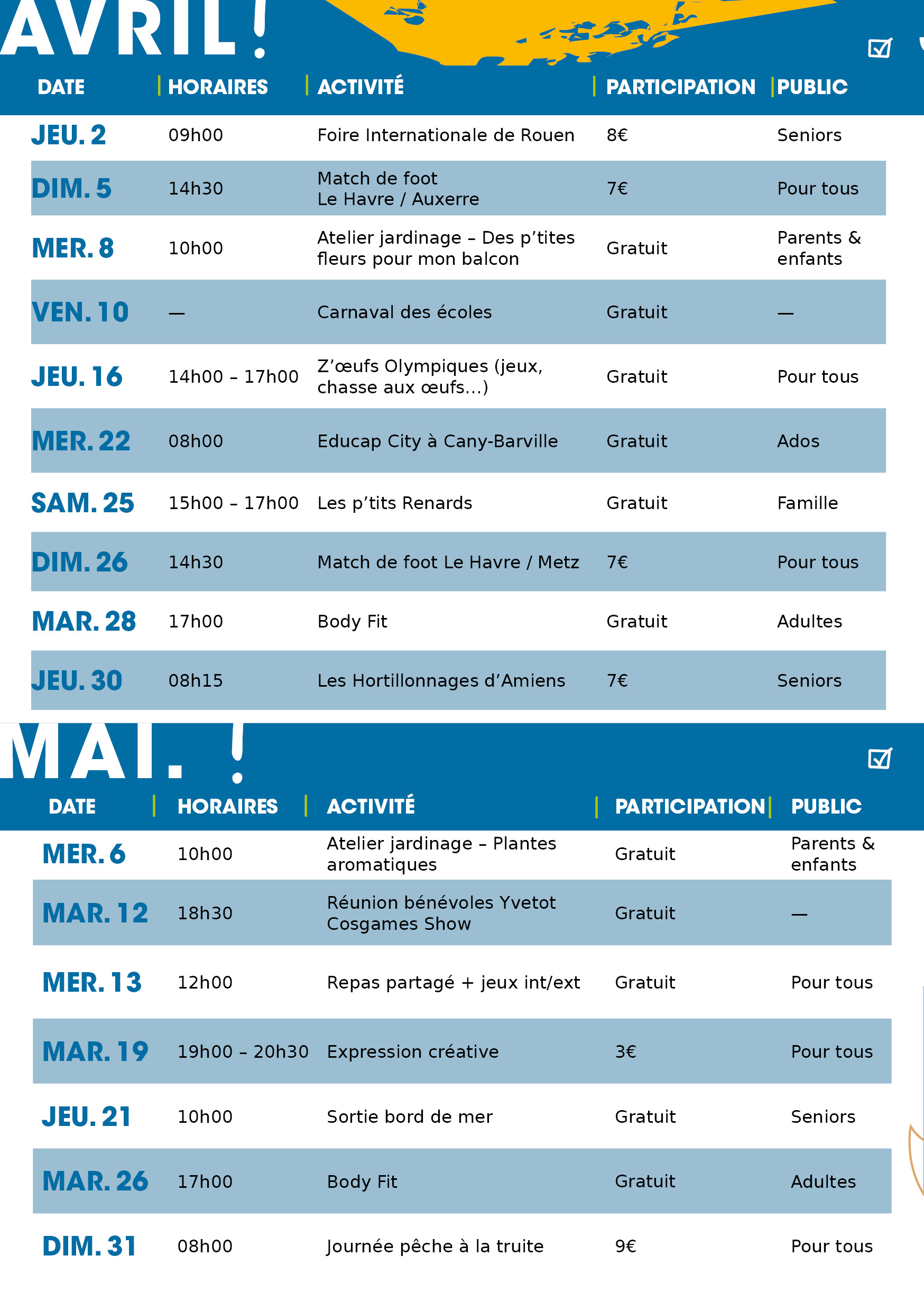 Yvetot vous présentent le programme des activités à la MDQ d'avril, mai, juin 2026